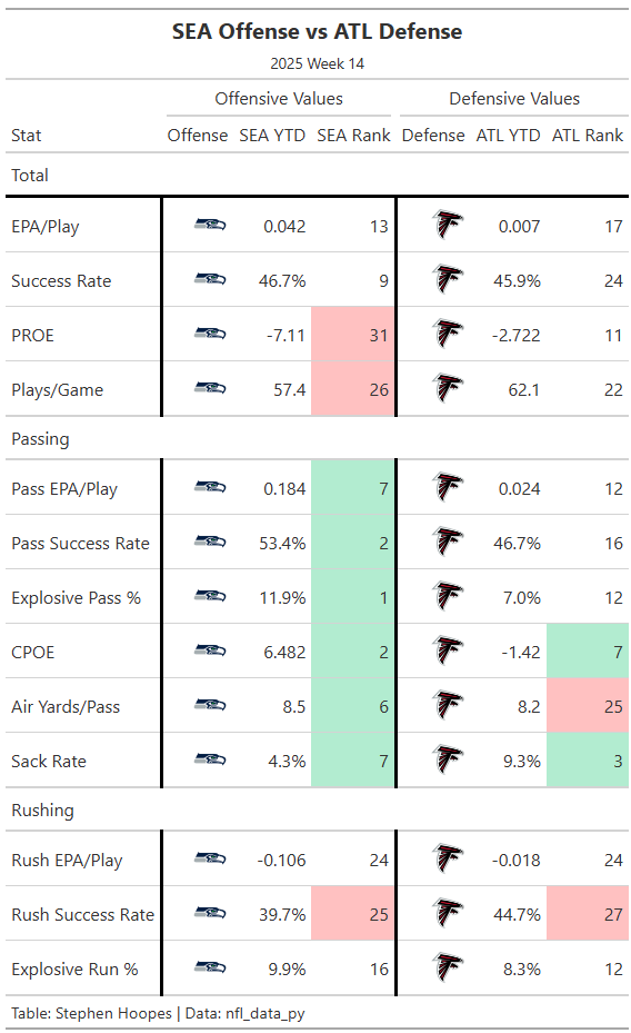 • Another run-heavy performance from the Seahawks, hitting -8.2% PROE or right around their season-long average.