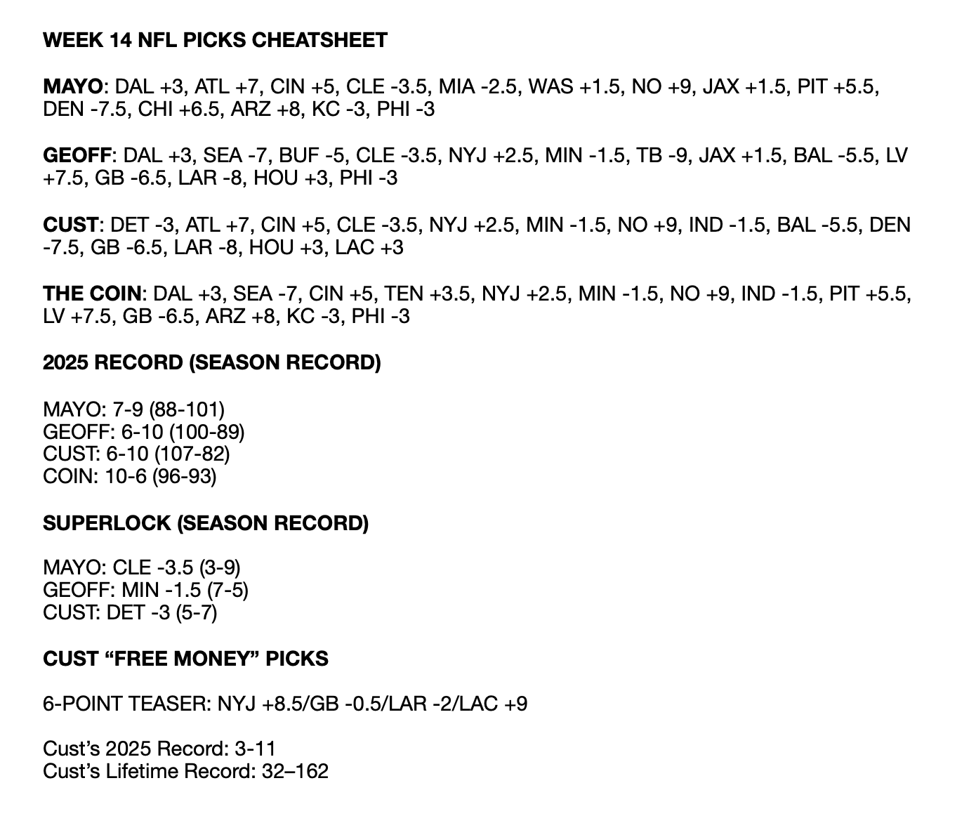 Mayo, Geoff Fienberg, and Tim Anderson go game-by-game and make their 2025 Week 14 Spread Picks, Bets, Survivor Picks, and Props. Plus, a mini Cust Corner on the Snooze Button, Pot Holes, and Turkey