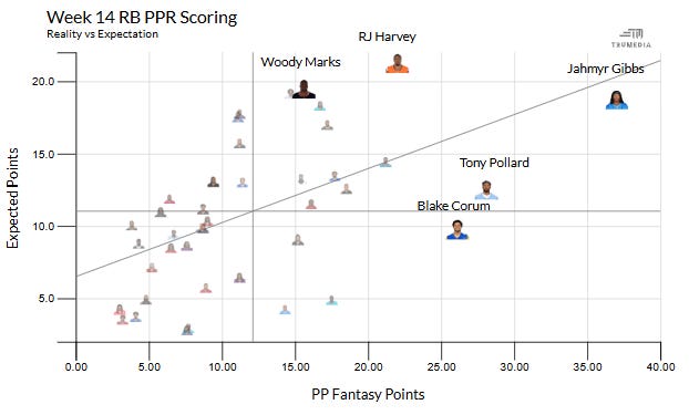 WEEK 14 RB Points vs Expeceted Points