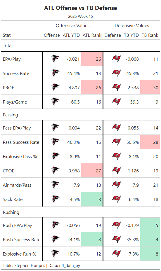 • In a game that was out of reach by the end of the 3rd quarter, the Falcons passed at a rate 13.1% below expectation.
