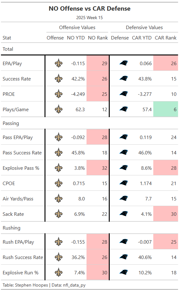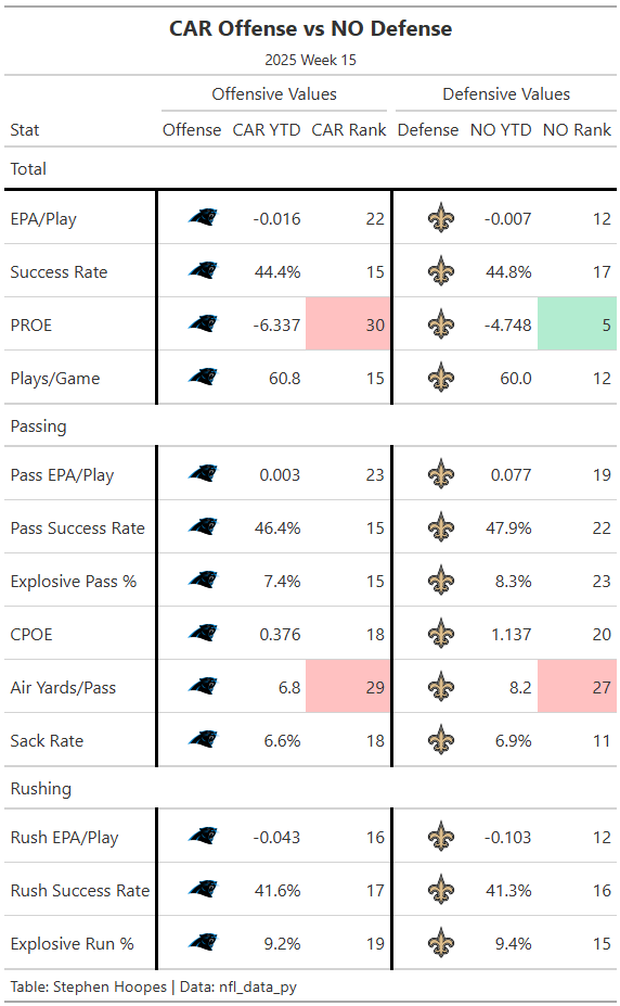 • The Saints were very run-heavy last week, which isn’t a surprise, and they ended the day about average in passing and rushing efficiency.
