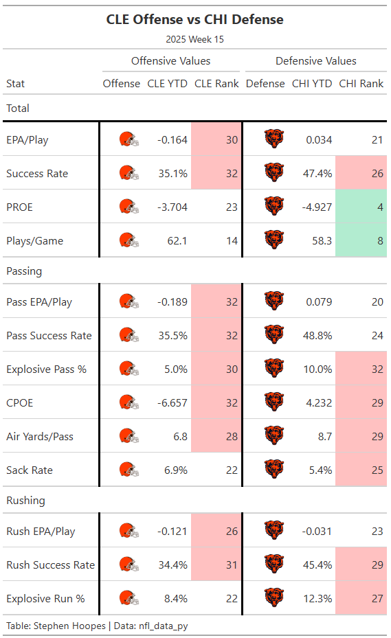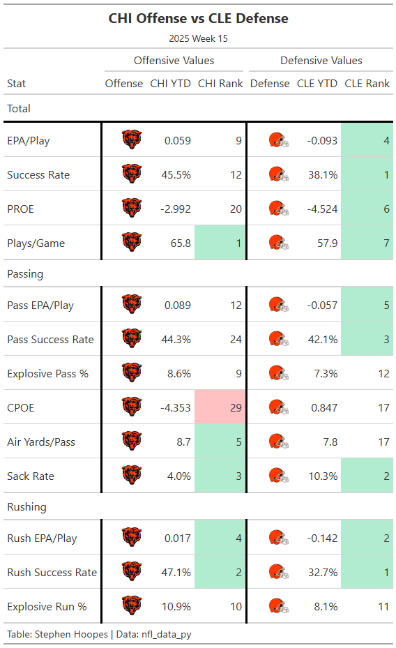 • Additionally, Browns’ opponents opt to run on them at the 6th-highest rate in the league, something the Bears will be happy to do.