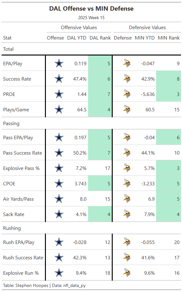• It was an inefficient day for the Cowboys’ offense last week, with Dak Prescott ultimately hitting -0.03 EPA per play with 1.2% CPOE on a high 10.6-yard aDoT.