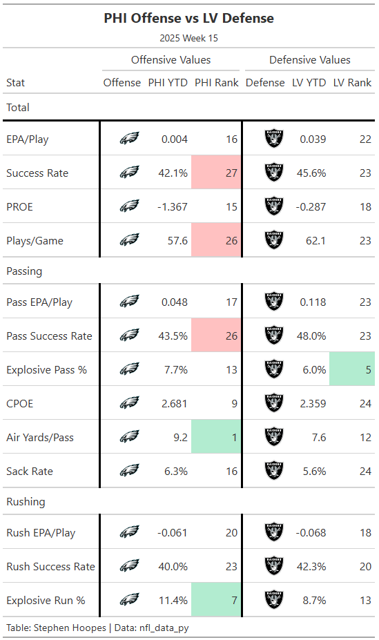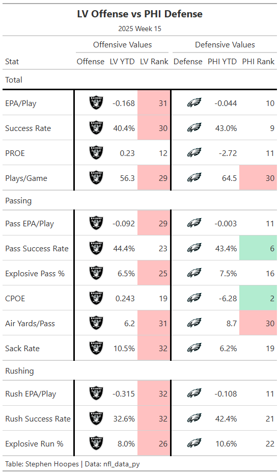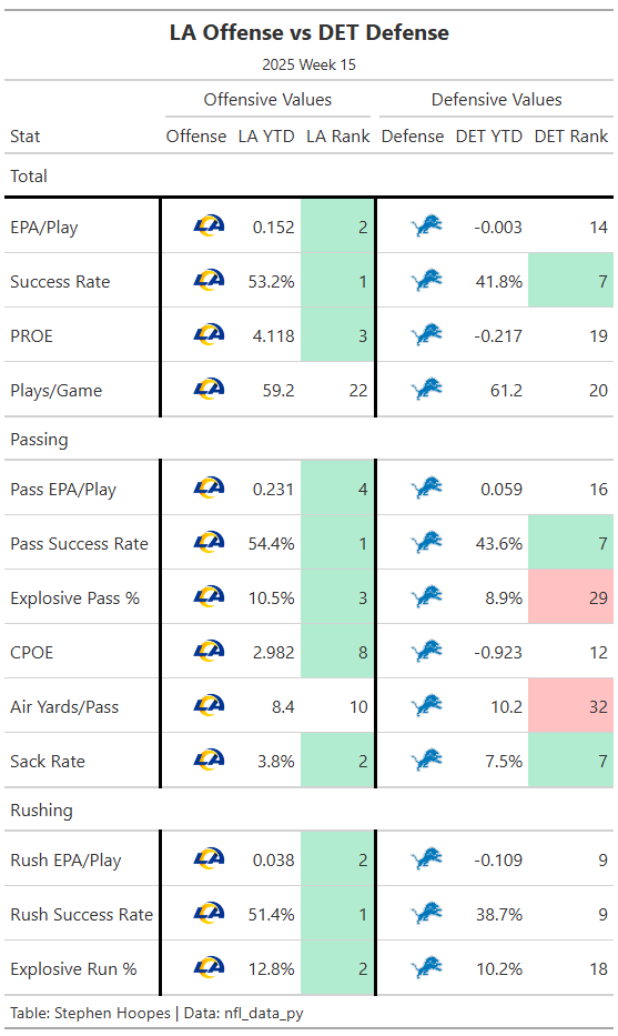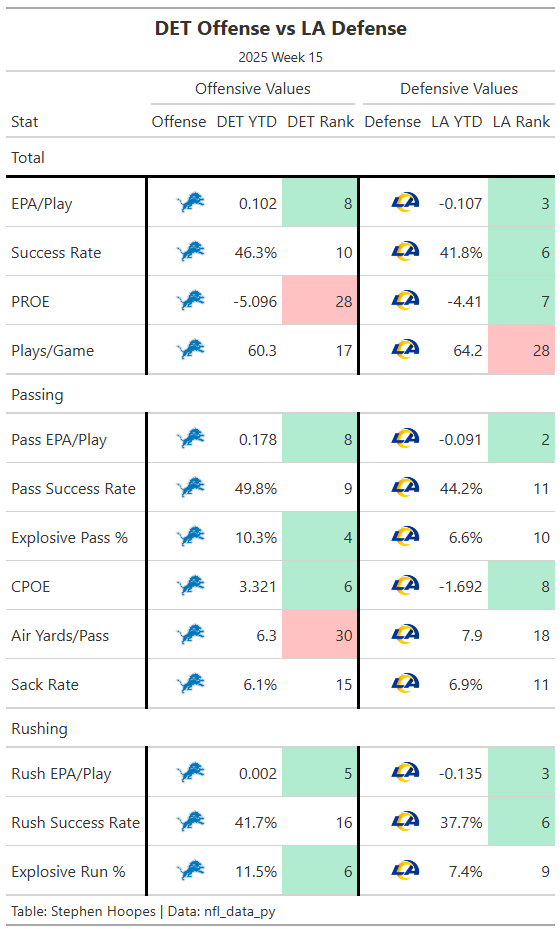 • When this team is clicking, they are *clicking*, with Matthew Stafford now the leading MVP candidate and top-four in EPA behind Jordan Love, Drake Maye, and Josh Allen.