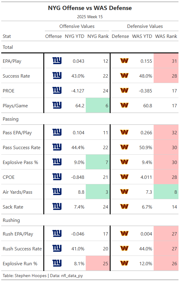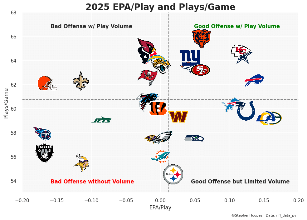 I like to use the graph below as an anchor point each week. It shows the efficiency of each offense on the x-axis (via EPA per play) and the number of offensive plays per game on the y-axis. We ideally want our fantasy assets to play on teams in the top-right corner. From this point, we can adjust for a ton of things, including matchups that we’ll dig into below. But my recommendation would be to take a final look at your lineups before the games kick off. Walk through each player, making sure you feel good about their talent, volume, and team-situation relative to your other options. And then let the chips fall where they may. Good luck this week!