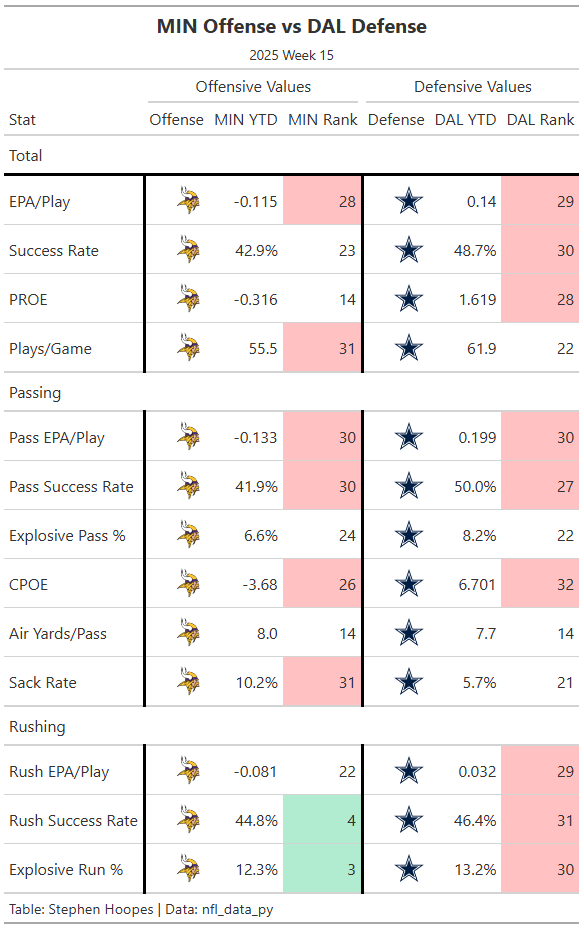 • Kirk Cousins delivered only 7th-percentile passing efficiency, and he’s now only ahead of J.J. McCarthy and Cam Ward in EPA per play.