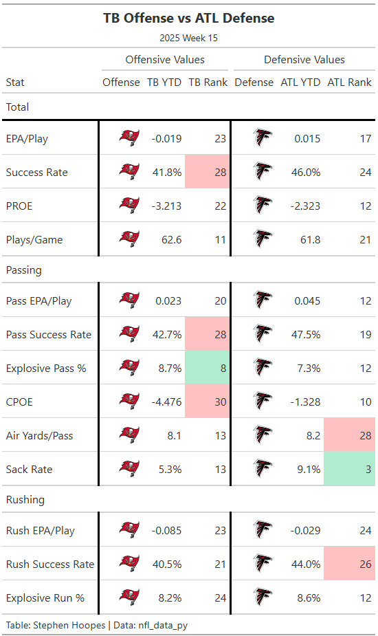 • The Falcons’ pass defense is stronger than their run defense, and they’re particularly good at getting to the QB, ranking 3rd in sack rate and 11th in pressure rate, according to SIS.