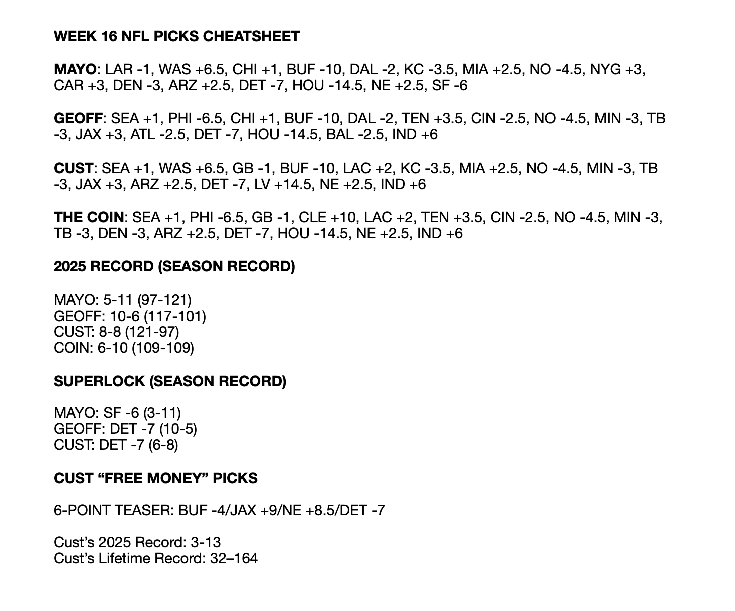 In the most talked about show of the season, Pat Mayo, Geoff Fienberg, and Tim Anderson go game-by-game and make their 2025 Week 16 Spread Picks, Bets, Survivor Picks, and chat all things NFL. Plus, a mini Cust Corner on Ice Cream and Meatballs with a large debate on who is the most famous Steve Austin.