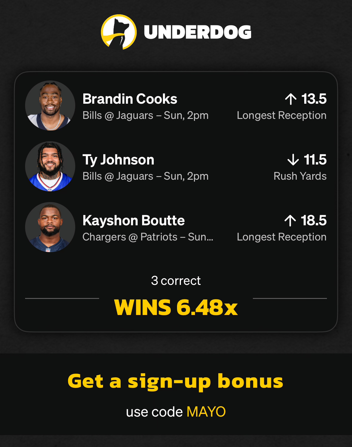 TAIL OR FADE + code “MAYO” at underdog for a deposit bonus up to $1000