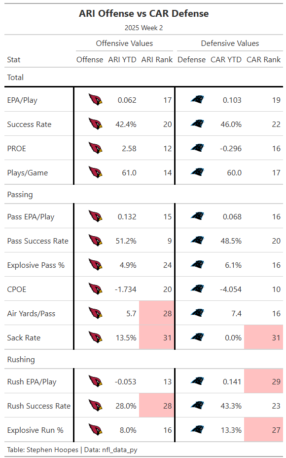 • As expected, the Cardinals have a very concentrated passing attack with Trey McBride and Marvin Harrison Jr. the only viable options.