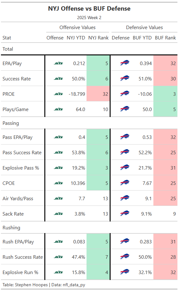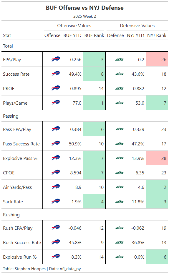 • We can largely throw out all of the Bills’ defensive data from Week 1 as they won’t play the Ravens every week (that’d be awesome though).