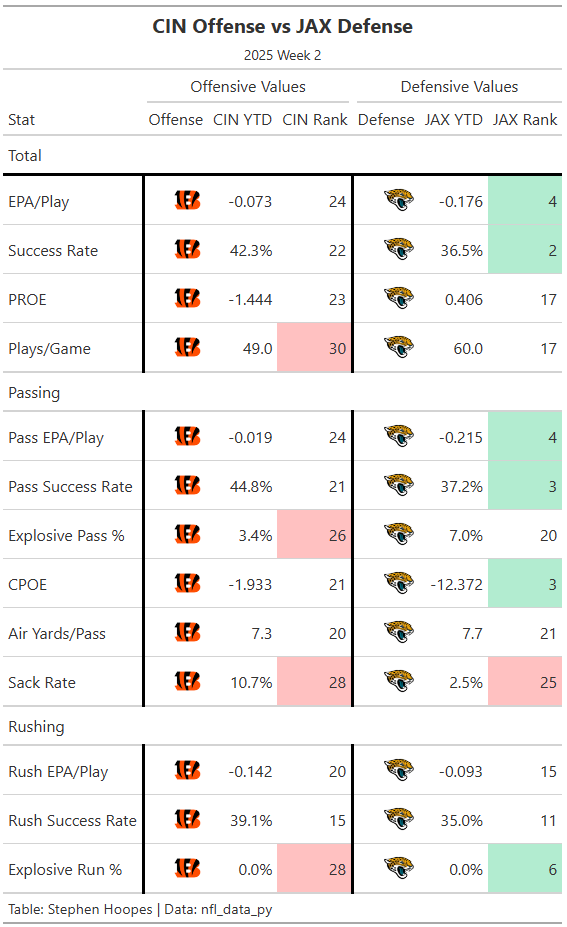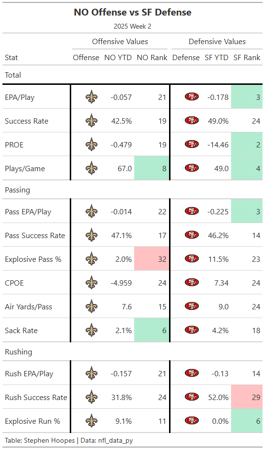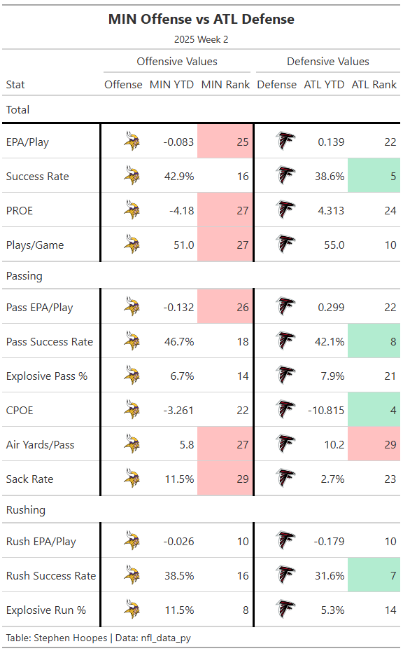 • The number of carries was similar between Bijan Robinson and Tyler Allgeier, with the Falcons’ ground attack finishing dead-last in rushing EPA per play.
