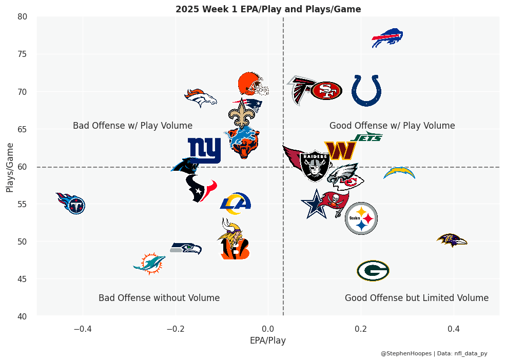 Welcome to the first edition of Hoopes There It Is, the game preview article with the best name and graphs in the industry. I’ll preview every matchup in Week 2 through an advanced stats lens before digging into the fantasy football implications. As a starting point this week, the graph below shows EPA/play on the x-axis and plays per game on the y-axis. Ideally, your favorite team is in the top-right corner with offensive efficiency and lots of volume.