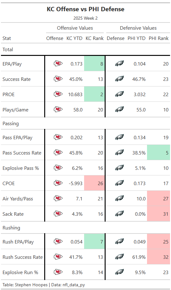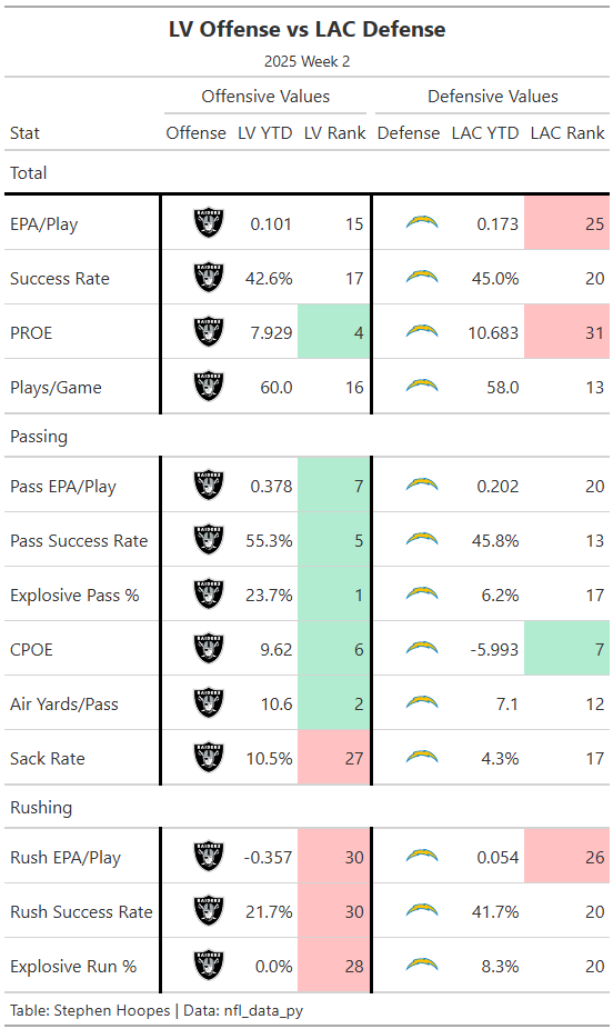 • The Chargers opted to pass at a rate well above expectation with great success as a means to avoid a strong Chiefs run defense.