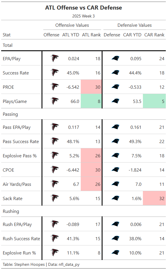 • But it’s a solid bounce-back spot for the Falcons’ pass game with the Panthers’ defense last in the league in sack rate.