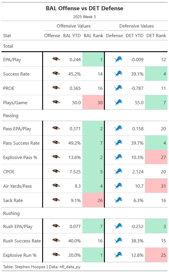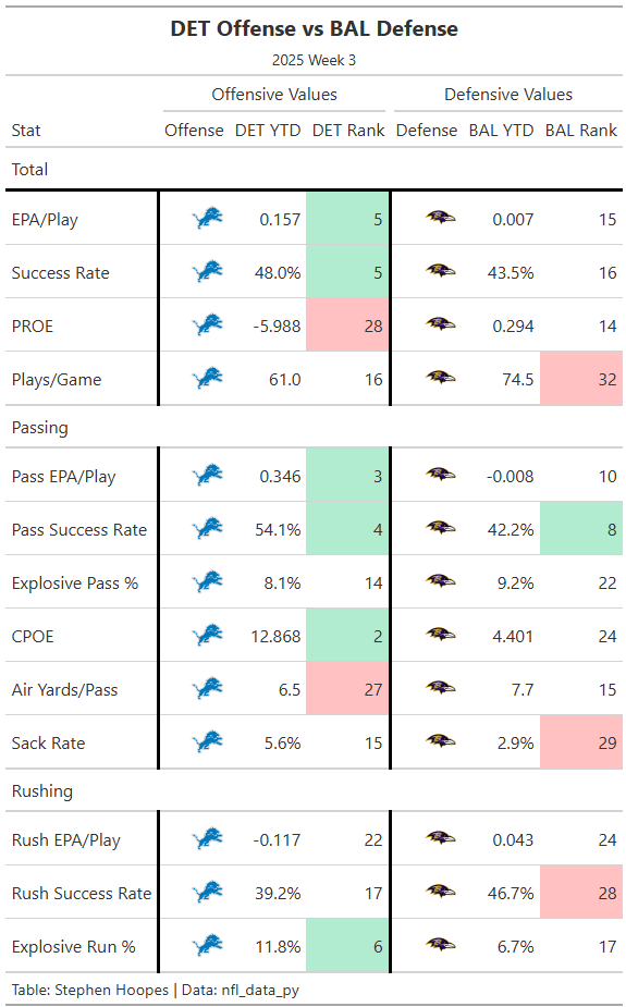 • The Ravens’ defense is more susceptible to the run through two weeks, which isn’t a problem for the Lions, who run the ball at the 5th-highest rate vs expectation.
