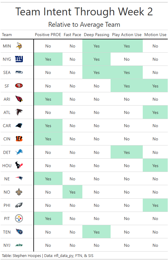 We have two data points. It’s not much, but it’s enough to start searching our way around the dark for clues. With that in mind, I want to start today with early-season team intent. What do these teams *want* to be doing? And I’ve got five categories to classify intent: pass rate over expected (PROE), situation-neutral pace, play action use, motion use, and target depth. To me, our ideal NFL team for fantasy is pass-heavy, fast, uses a heavy dose of play action and motion to make life harder on the defense, and is willing to pass the ball down the field.
