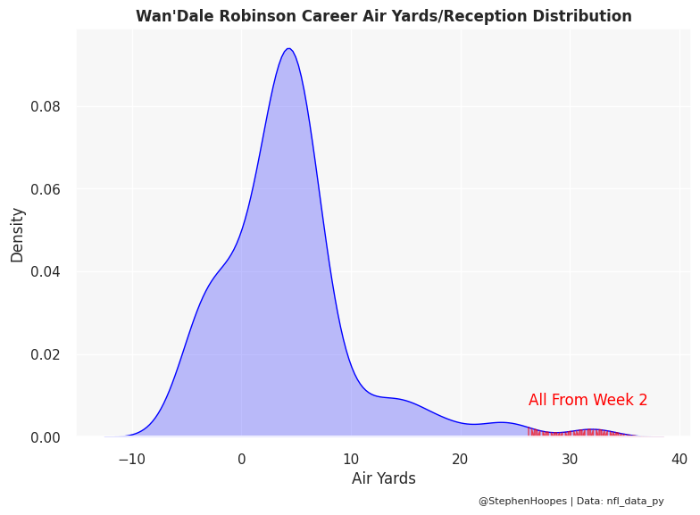 • The graph below shows the distribution of the air yards for all of Robinson’s career receptions.