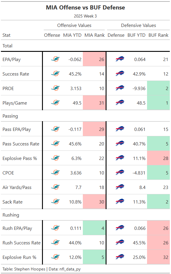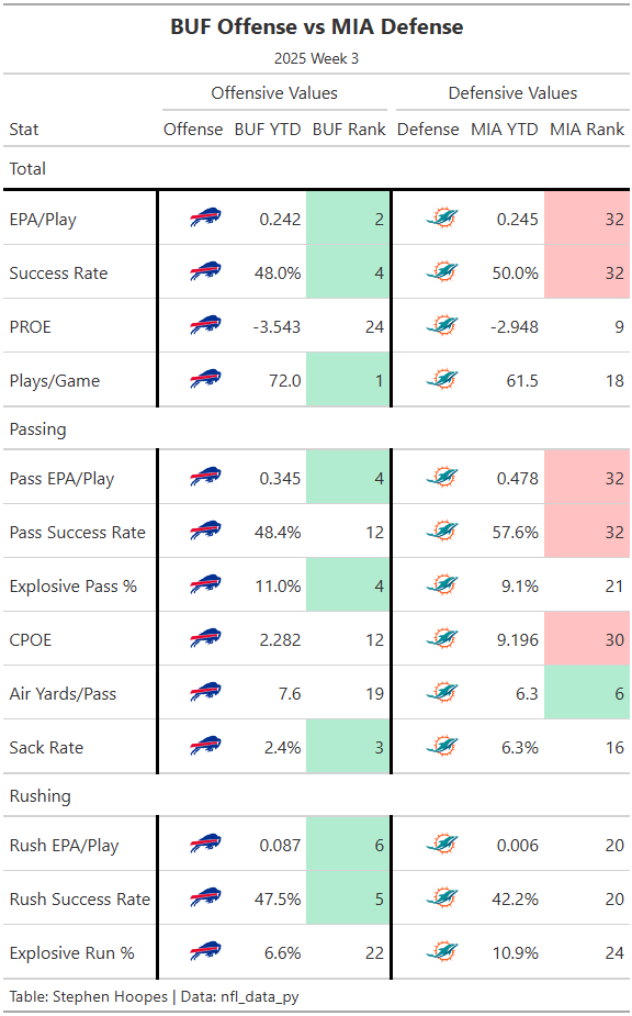 • But technically, the Dolphins’ offense is 4th in rushing efficiency, and the Bills’ defense is near the league bottom, actually giving up the highest rate of explosive runs.