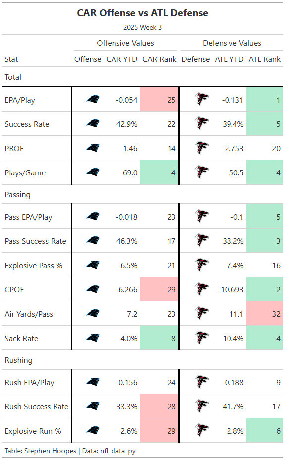 • It’s a pretty terrible spot for the Panthers offense, as the Falcons have the most-efficient defense in the league through two weeks.