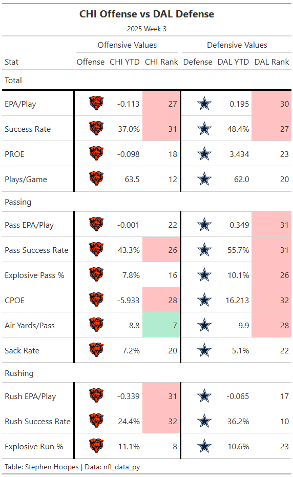 • The Cowboys’ defense is one of the worst in the league against the pass, and the Bears are absolutely unable to run the ball.