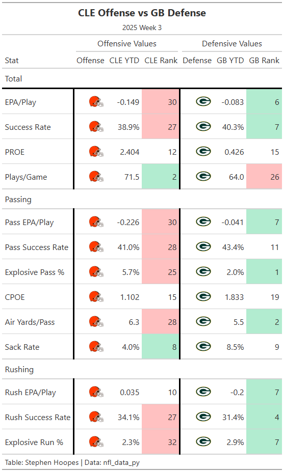 • We also have a mess at the RB position, with Jerome Ford taking 50% of the snaps last week and Quinshon Judkins and Dylan Sampson splitting the other half.