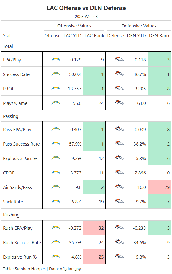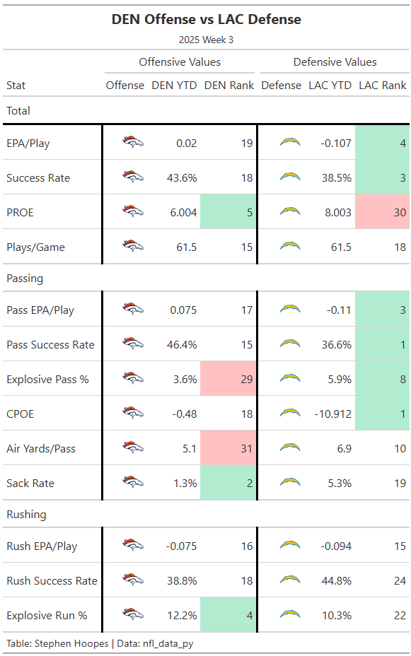 • The Chargers’ defense is elite against the pass but do give up explosive runs, while the Broncos offense is 4th in explosive run rate.