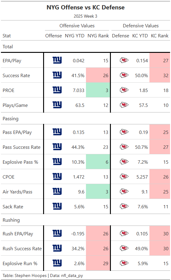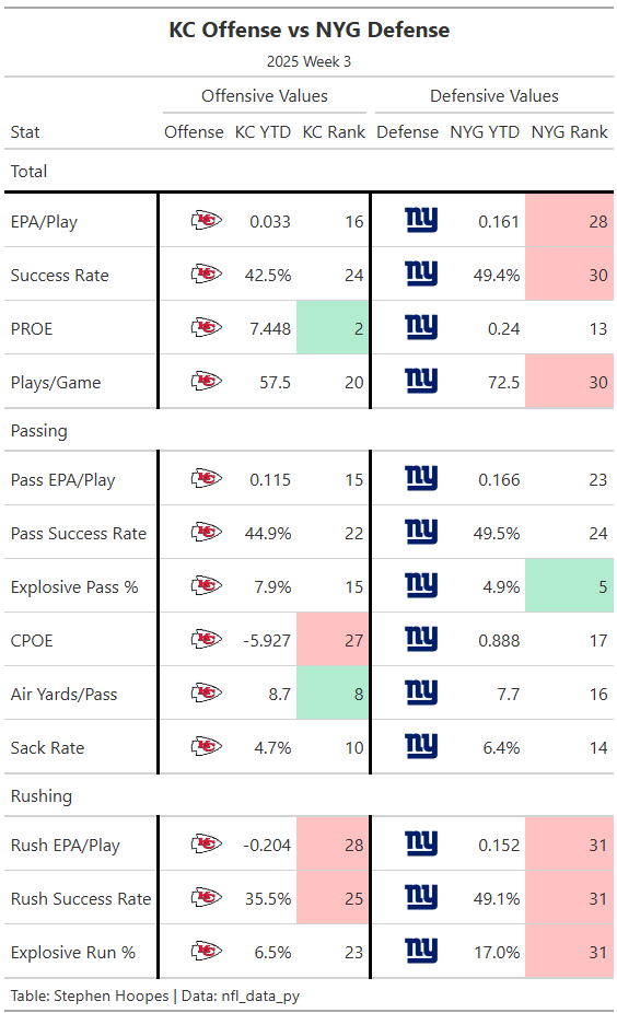 • The Giants’ run defense is second-to-last in every major run category, but the Chiefs won’t be able to take advantage of it because they can’t run the ball at all.