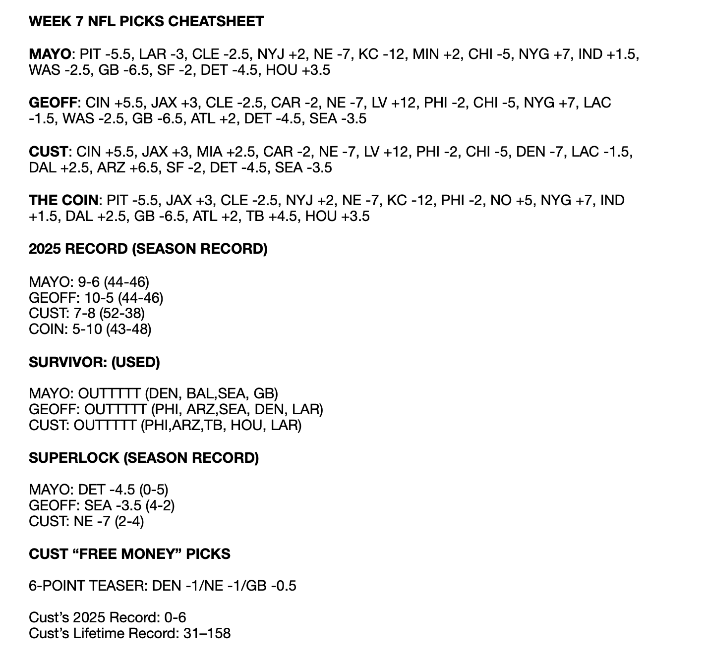 Mayo, Geoff Fienberg, and Tim Anderson go game-by-game and make their 2025 Week 7 Spread Picks, Bets, Survivor Picks, and Props. Plus, a mini Cust Corner on Geoff’s $20K a plate dinner.