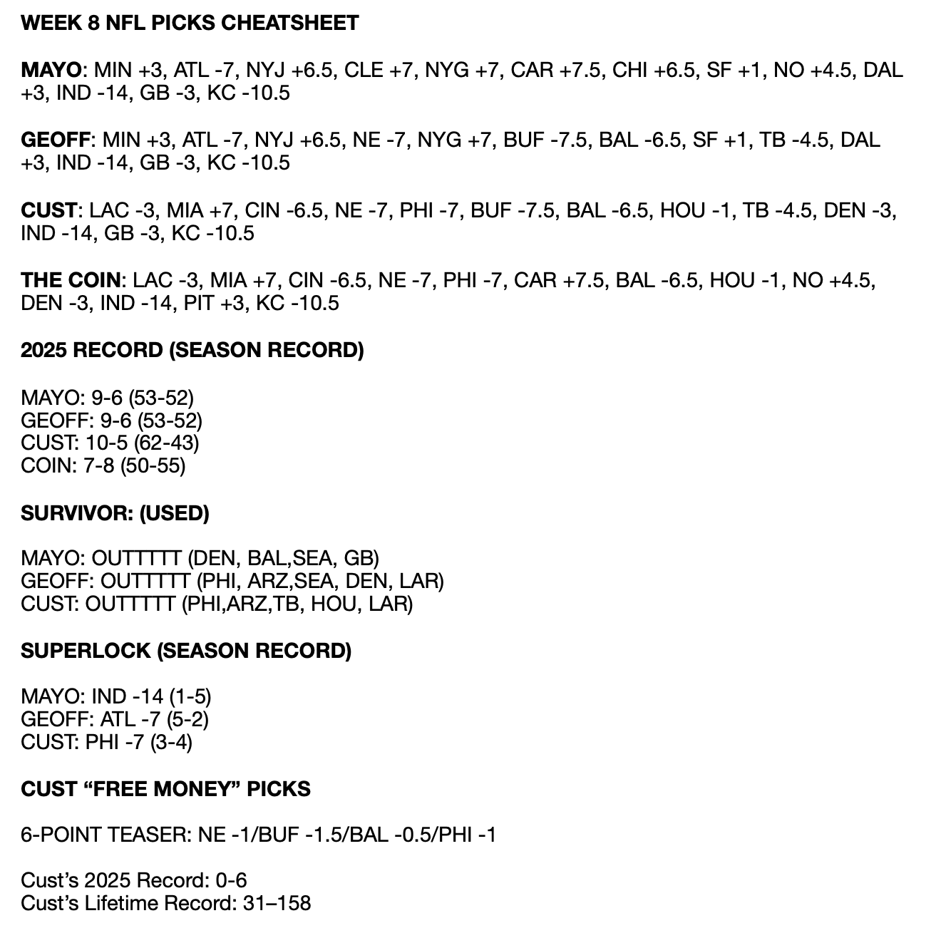 Mayo, Garion Thorne and Tim Anderson go game-by-game and make their 2025 Week 8 Spread Picks, Bets, Survivor Picks, and Props. Plus, a mini Cust Corner on towel usage, best fast food burger and mailbox questions from Dear Custy.