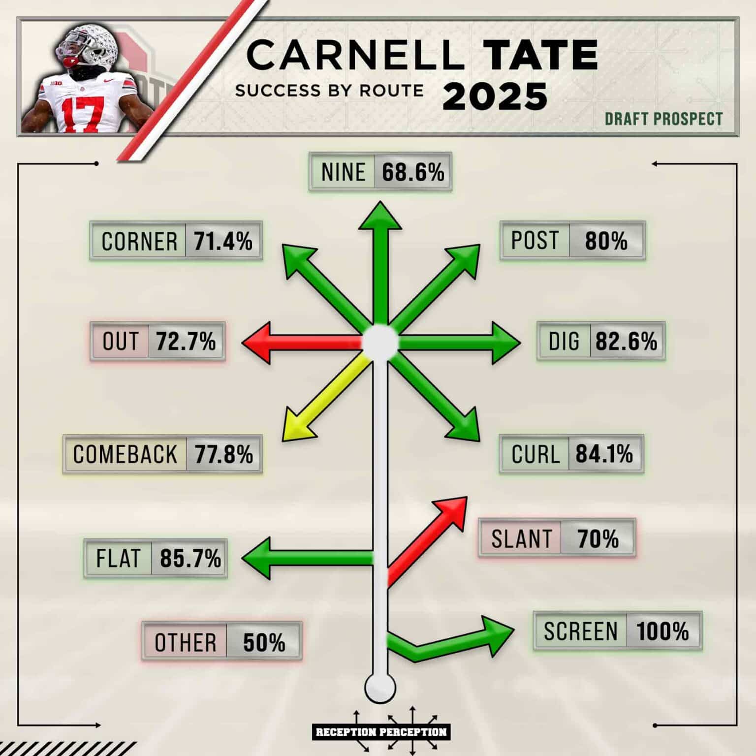 Whether it’s a reflection of where he was used or a lack of “wiggle” to his athletic profile, gaining yards after the catch is admittedly not one of Tate’s strong suits. The former Buckeye averaged 4.8 yards after the catch over his career, paired with only 17 missed tackles forced across 121 receptions. For comparison's sake, both Skyler Bell (835) and Zachariah Branch (634) had more YAC in 2025 than Tate’s 579 career yards after the catch, and twelve draft-eligible wide receivers had 17 or more MTFs last season alone.