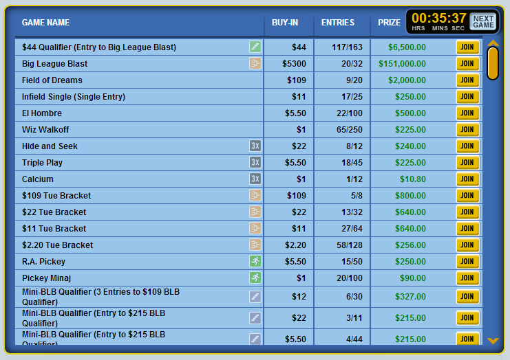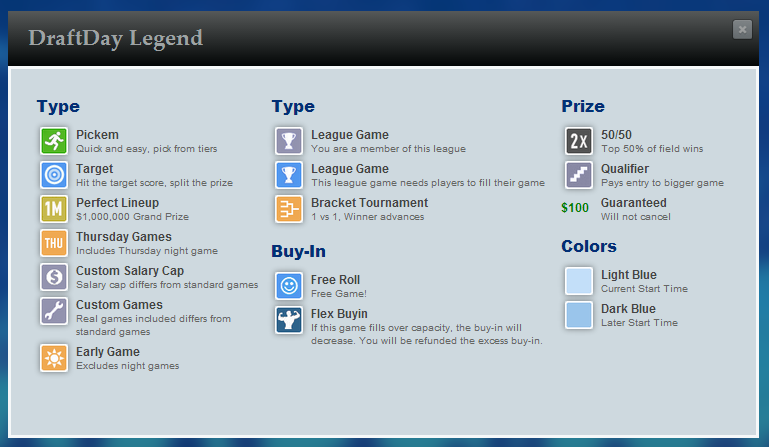 DraftDay has an excellent interface. The minimalistic design resembles that of an online poker layout. The main lobby is easy to use, allowing users sort and filter by sport, amount of contestants, buy-in, payout structure, and start time. Icons with hover-over text provide additional details about each game.