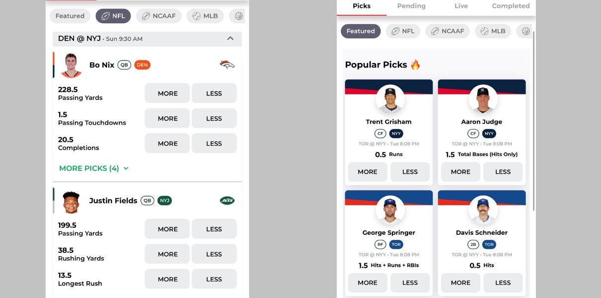 You will see more/less picks for top players across these leagues, like Patrick Mahomes, Shai Gilgeous-Alexander, and more. For an NFL player, you will see categories such as passing yards, rushing yards, touchdowns, and more. For basketball, you will choose between points, rebounds, assists, and more.