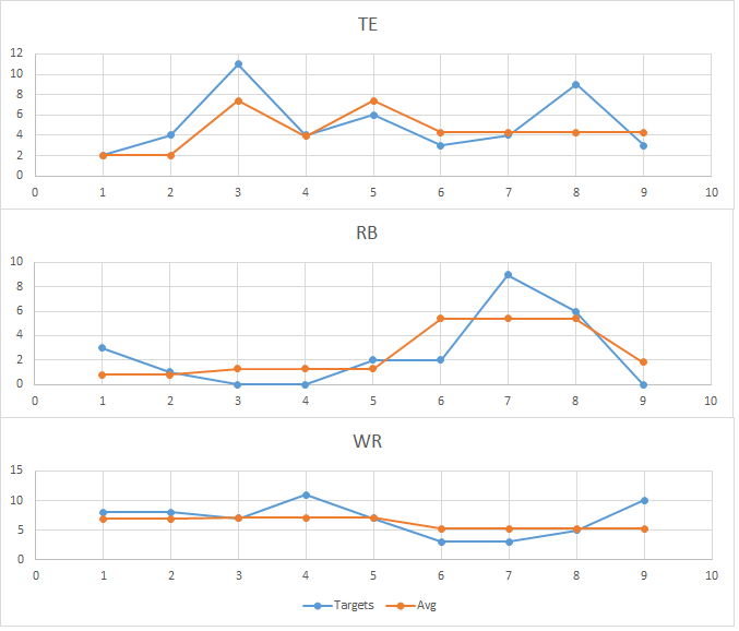 The running back production, or lack thereof, was surprising. But, an important element was missing. San Diego has featured change-of-pace RBs throughout most of Rivers’ tenure. Darren Sproles and Danny Woodhead complemented the primary running back in their abilities as pass-catchers. Their targets remained stable against their seasonal average. Austin Ekeler has shown himself to be a viable receiving threat out of the backfield. Assuming he continues to carve out a role, his role in poor weather conditions should be monitored.