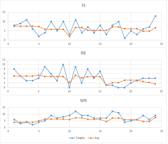 - How does target distribution shift for these offenses across RB/WR/TE?