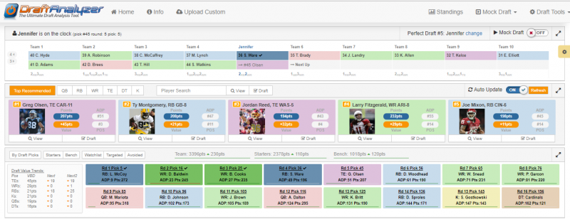 Grabbing Olsen gives me solid points from the TE position and there are still guys like Fitzgerald, Michael Crabtree, Willie Snead and Golden Tate on the board, providing hope that I will still get a solid WR3 on my next turn.