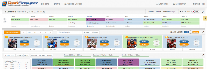 Dez Bryant and Doug Baldwin have the exact same projections, both in total fantasy points (245) and their VBD, or value based draft (+42). This amount refers to the value of a player compared to the worst starter at that position. Both of these guys are solid, but I chose Baldwin based on potential in his offensive scheme. Dallas is a run-first team, and Baldwin has finished the past two seasons in the top nine among WRs. Looking ahead, the drafters in front of me had taken two RBs and two WRS, so their selections did not come into play, yet.