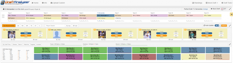 From a point maximization standpoint, it makes sense that Draft Hero wants me to roster my RB1, but drafts are a race to win the flex position. My goal is to start as many top-20 WRs as possible each week and Demaryius Thomas gives me three players with a WR1 finish in their range of possible outcomes. A look ahead showed that my favorite group of RBs—Spencer Ware, Mark Ingram, and C.J. Anderson—should still be available in the next round, so I’m fine without a RB through the first three rounds of a PPR draft.