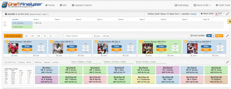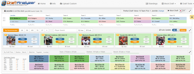 Draft Hero recommends Sammy Watkins here, but I’m personally more of a fan of Baldwin for this pick. I briefly debate selecting a RB such as Leonard Fournette, or Isaiah Crowell, but decide to stay with my plan of waiting on my RB2, since I already have the best at the position on my roster, and will most likely still see Ware or Todd Gurley at the 4-5 turn.