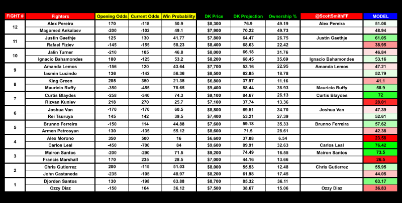 Djorden Santos $8700 - Santos projects well in our model, but there are some red flags that should be taken into account. First, it is obvious that Santos is a debuting fighter, so he hasn’t proven himself at this level yet. Secondly, his resume is soft, and his finishes have come to fighters with losing records, the last coming in 2021. When he fights decent competition, he often fights to a decision. Ozzy Diaz will have a 4-inch height and reach advantage as well. Our model projects Santos with the third-highest projection and a win probability of 63% this week. Santos should remain in consideration as a pivot to some of the premium plays, but beware of the holes in his profile this week.
