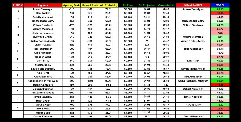 Analysis: Tsarukyan, Orolbai, and Almabaev all offer the grappling advantages to score north of 100 points. Muhammad offers championship experience and a solid floor in a fight projected to go the distance. Almakhan is likely the pivotal fighter in the lineup, but offers finishing upside while having 15 minutes with Umar Nurmagomedov under his belt. Hooker is our punt play stack with Tsarukyan, while Dalby could be subbed in his place as a pivot.